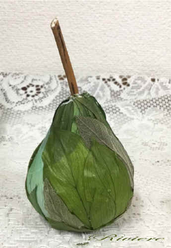 洋梨のオブジェ リーフと極細ブリオンで洋梨を作ります。 一体化するためにコーティングも施しました。これから更にフルーツのアレンジへと進み、オブジェを完成させていきます。みのりの季節に相応しい楽しい課題ですね。 |