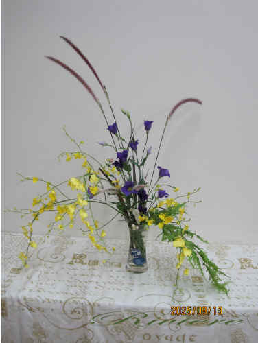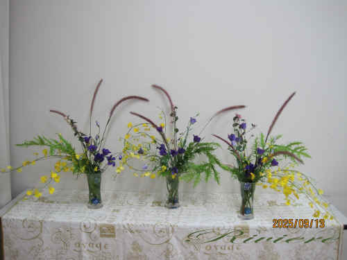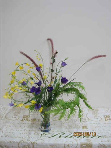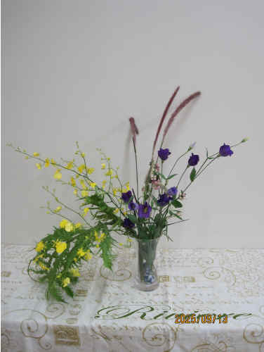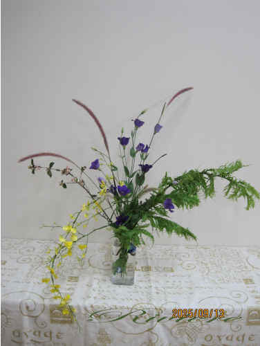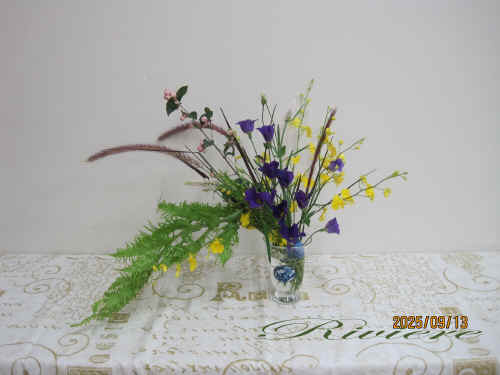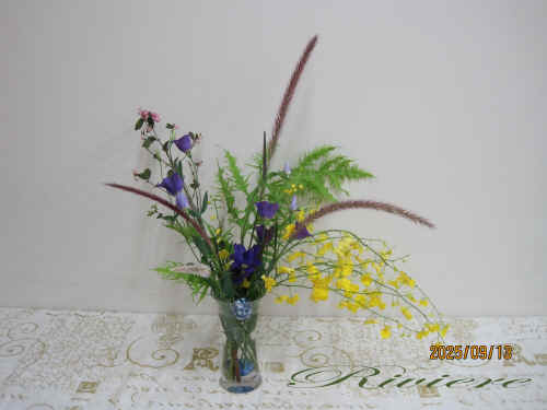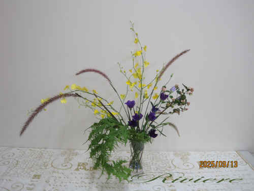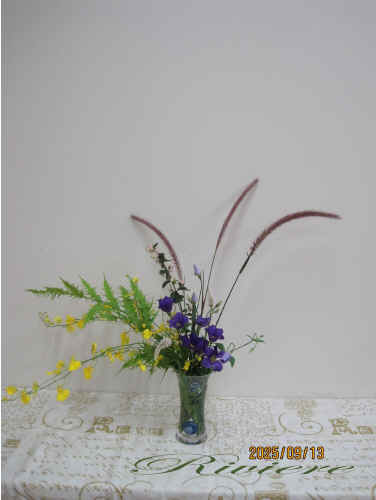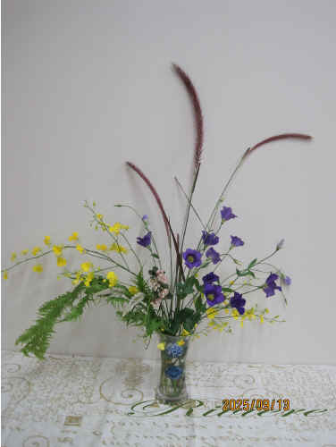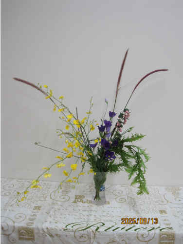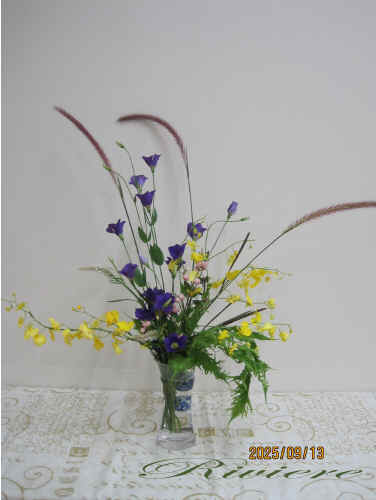夏の名残り 秋の訪れ 今回のテーマは花束のセキュアリングとして連続リングを使ったテクニックに挑戦してみました。コイル状につながったメカニクスを前後 左右に動かす事で自由に角度を変える事ができます。コイルに花が入れば器の中でしっかりと立たせる事が出来ます。更に花を足して完成したアレンジを再度花束としてまとめます。要領が分かると新しい花束の作り方として面白い作業となります。充分に秋を感じるアレンジになりました。 |