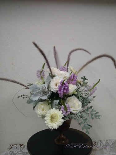 花材を見て即興でするフリーアレンジです。 テーマをローズタワーとして、パープルファウンテングラスがタワーの華やかさを出しています。静かなトーンですが、製作者の弾むような心意気が感じられる作品です。