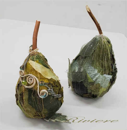 フルーツのドライ装飾 象ったフルーツにドライリーフで色付けました。色の濃淡で様々な表情が生まれます。1個でも世界が広がるフルーツオブジェ。ハロウィーンにクリスマスに出番が多くなるアイテムです。 |