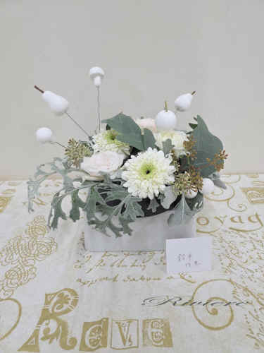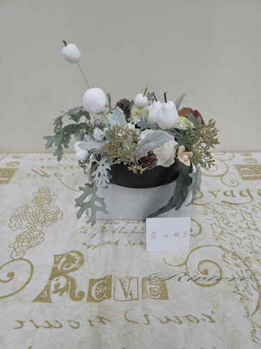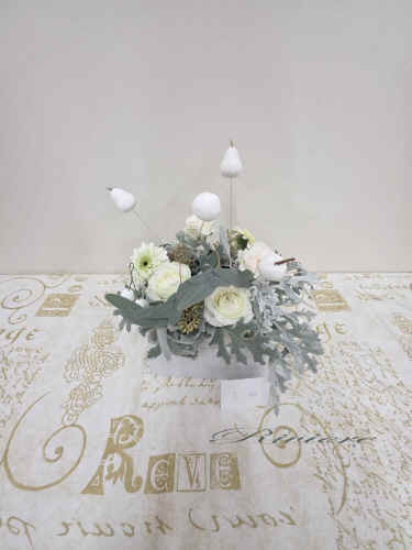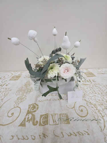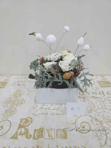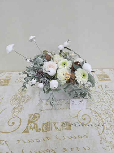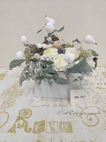 ハロウィーンパーティー」 シルバーのリーフの上に主役クラスの花々。今日は花弁の渦を見せるように低く低く入れて頂きました。ユーカリの葉はガーランドに。白いシルエットは紙粘土で手作りしたフルーツとマッシュルームです。ふわふわとお花畑の上をあえて浮遊させてみました。大人のハロウィーンパーティーが始まりました。 |