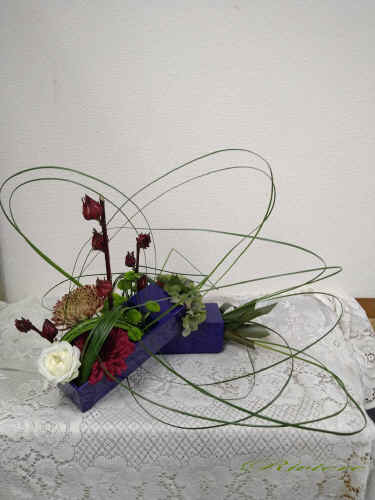 あふれる秋に訪れ 器を2つ組み合わせて高低差を作り、色で秋を表現しています。この器は2面にファンデーションが入るので、縦横に花を挿すことができます。その結果、スチールグラスのラインがおおらかに、そしてパワフルに季節の訪れを語っています。色々な角度から楽しめる仕上がりです。 |