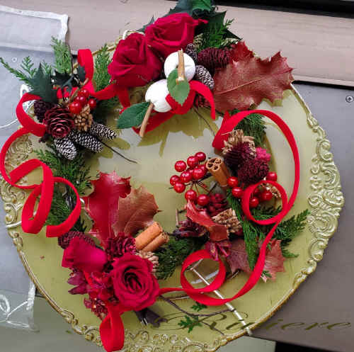 お皿に木の実 フルーツやドライフラワーでリースを作成。お皿と一緒に掛けて飾ります。フルーツはこれから増やして行く予定。クリスマスまでの楽しみです。