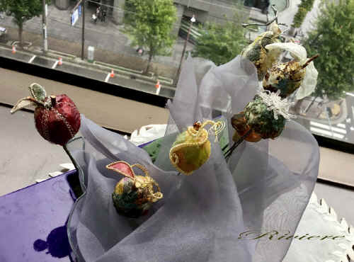 ハロウィーンに合わせて、フルーツの装飾をシェーネアルバイテンでしました。タマネギの皮(ベージュ)やレッドオニオンの赤も加えて、植物が生み出す不思議な色付けができました。一つ一つの表情が作る楽しさに繋がります。 |