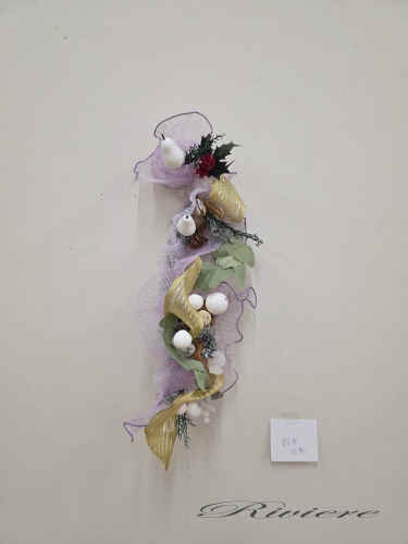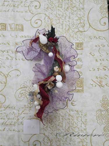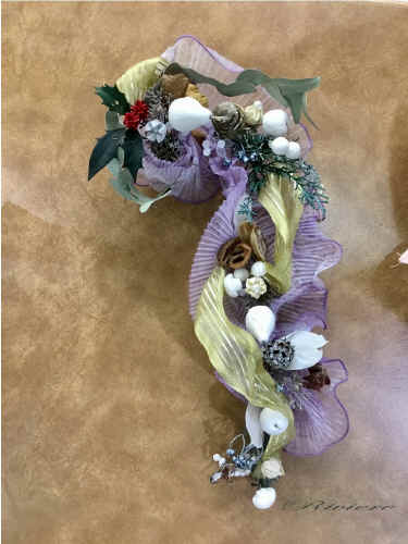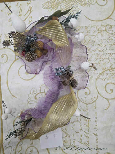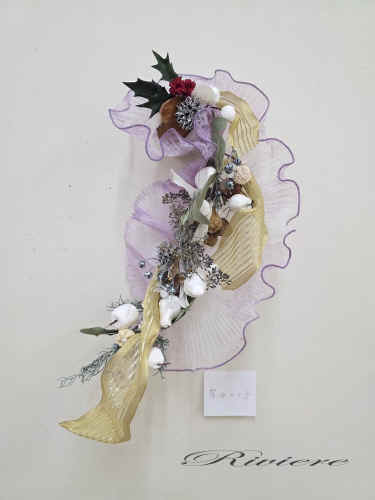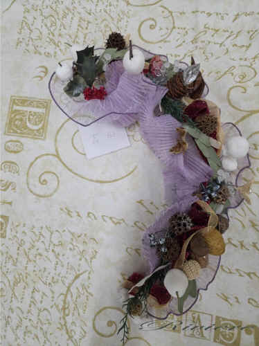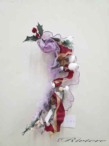 クリスマスプディング 2つの内容をはめ込んだ2025年リビエールのクリスマスガーランドです。先ず染めのチュールを使ってイギリスの代表的なプディング(巻き薔薇のように見えます)を作ります。イタリアのデッラロッビア家に伝わる伝統的な技法を学び、フルーツや木の実をチュールを動かしながら取り付けていきます。クルクル巻けば置き型の装飾ともなりますし、掛ければ縦型のガーランドと二刀流です。 |