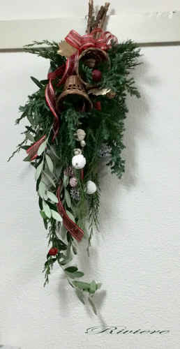 クリスマスの調べ クリスマスに合わせてドアスワッグを作成。エバーグリーンをオアシスに挿し、オリーブの自然なラインでまとめています。今年作ったテラコッタスタイルのフルーツも加え、たっぷりとしたリボンやベルがクリスマスの到来を告げます。オアシスの保水を欠かさなければ、フレッシュなグリーンが長く楽しめる壁面、置き型両用使いのスワッグアレンジです。 |