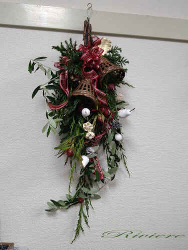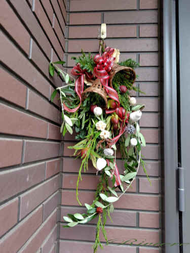 クリスマススワッグ ナチュラルラインのオリーブやエバーグリーンを活かして、クリスマススワッグを作りました。ハロウィーンのフルーツも一緒に、スィングするベルと共にクリスマスを待ちます。オアシスを忍ばせたメカニクスは見えませんが、クリスマス迄の緑を保つ算段。クラシックでのびやかな仕上がりになりました。 |