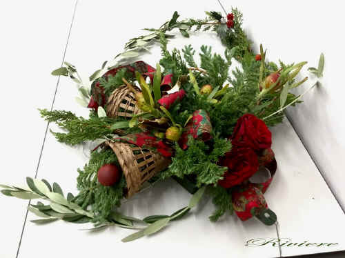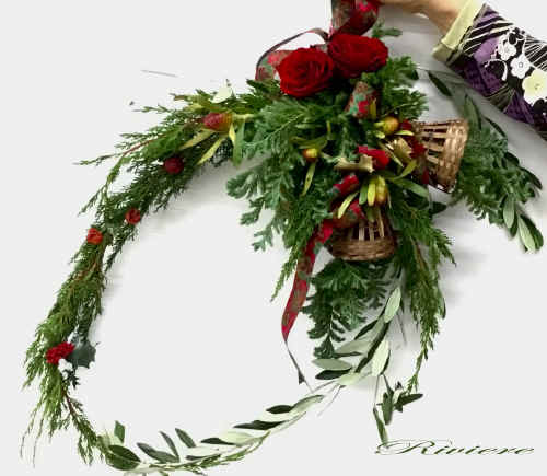 クリスマススワッグ クリスマスの鐘が鳴る 壁面用オアシスホルダーを使い、イブキ、ブルーバード、オリーブでクリスマススワッグを作成。クリスマス迄 エバーグリーンを保つために、オアシスに挿す枝は管の表面積を大きくとっています。タイトルにある鐘が鳴り響き、スゥイングするように、大きく斜めに束ねてみました。バランスを工夫した仕上がりになりました。 |