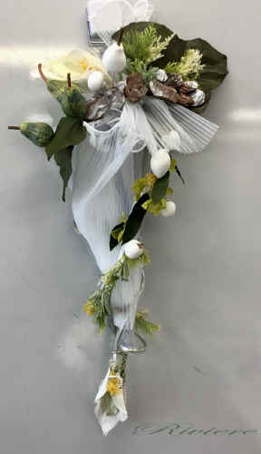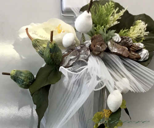 フルーツのパラソル たっぷりとしたチュールのパラソルに、カラーとフルーツを入れ込みました。トップの洋梨にはリーフ各種で色を付け、パラソルのフリルには敢えて色を付けずに、粘土のままのシルエットでレモンやマッシュルームを加えています。時間を掛けて丁寧に作り上げた作品には愛着が湧いてきます。時の流れも盛り込んだ仕上がりになりました。 |