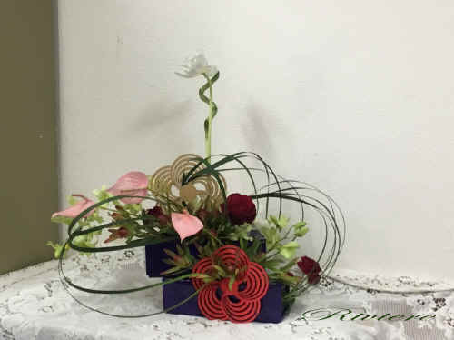 流鏑馬スタイルアレンジ 器を2段重ねてアレンジしています。高さが出る分、バランスが難しく、色の配分も複雑になりました。スパイラルバンブーに沿わせてチューリップを挿していますが、壁の白と同化してしまったのが残念です。ミスカンサスの流れで、ディスプレイコースの面白みを体験していただきました。 |