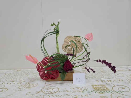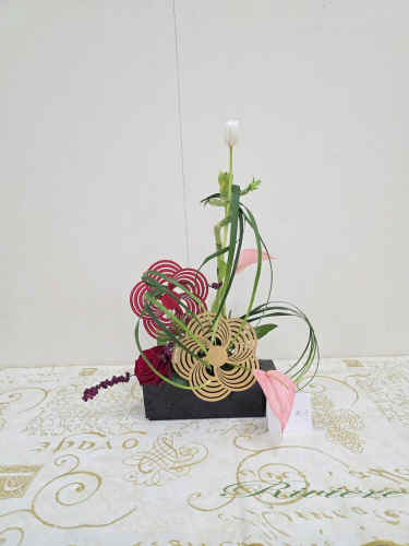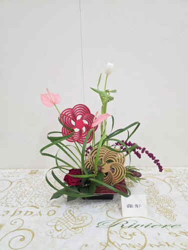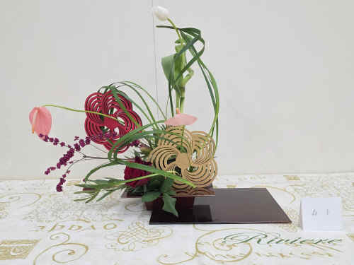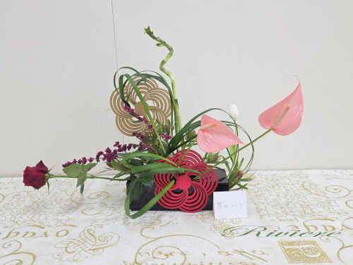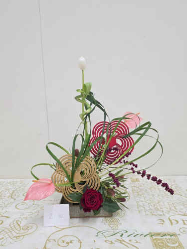 流鏑馬アレンジで祝う新年 流鏑馬は古くは飛鳥時代からある神事。馬に跨がり矢を放ち、的を打つ。大変勇ましい伝統的な行事です。私達は新年を迎えるにあたり、健康、合格、安全、平和を願って、2枚の梅のパネルを的にし、願いを込めてアレンジをしました。右から左、左から右へと人馬一体となって駆け抜けるイメージです。 |