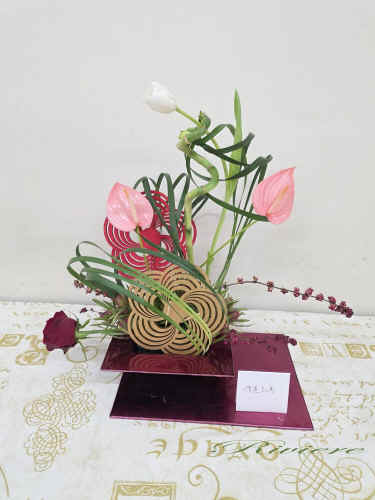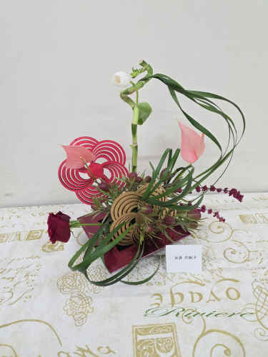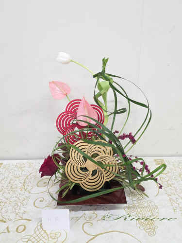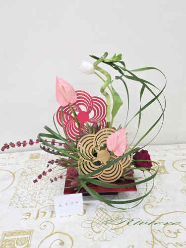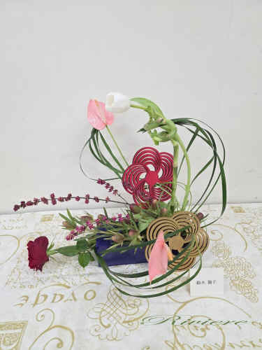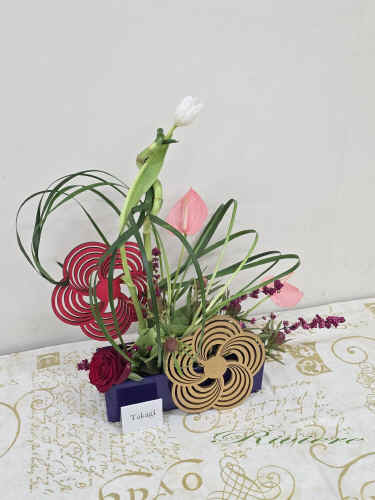 流鏑馬アレンジで祝う新年 流鏑馬は古くは飛鳥時代からある神事。馬に跨がり矢を放ち、的を打つ。大変勇ましい伝統的な行事です。私達は新年を迎えるにあたり、健康、合格、安全、平和を願って、2枚の梅のパネルを的にし、願いを込めてアレンジをしました。右から左、左から右へと人馬一体となって駆け抜けるイメージです。松竹梅と新年を迎える為のお花のアレンジは準備完了です。 |