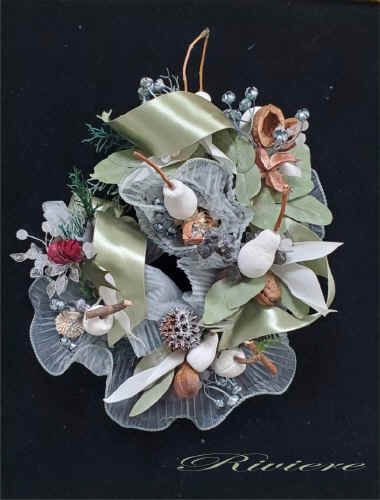 クリスマスプディングのようなリース 白色テラコッタのように成形したフルーツを盛り込んで作成した壁面飾りです。伸ばしたり曲げたり出来るのでこんもりと曲げてみました。盛り上がるリースは気分も盛り上がります |