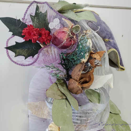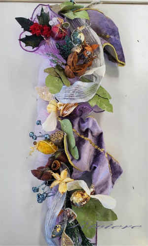 クレイジーなフルーツを使って壁面飾りに仕立ててみました。パープルシルバーの色がフルーツと良く似合っています。