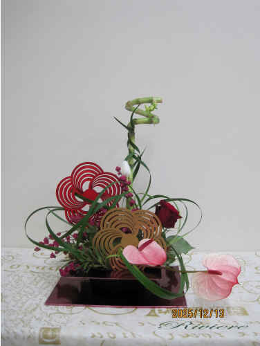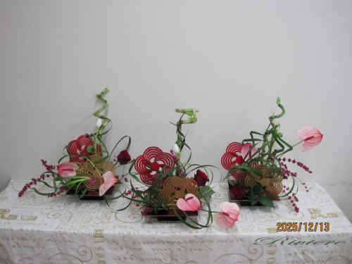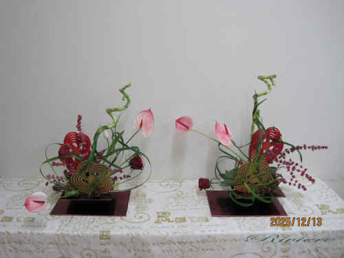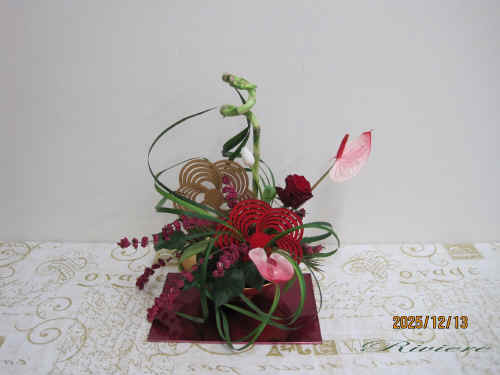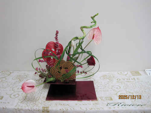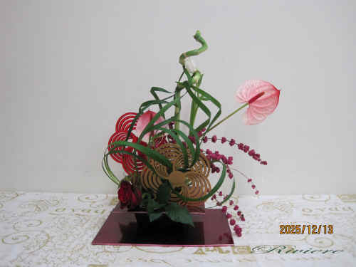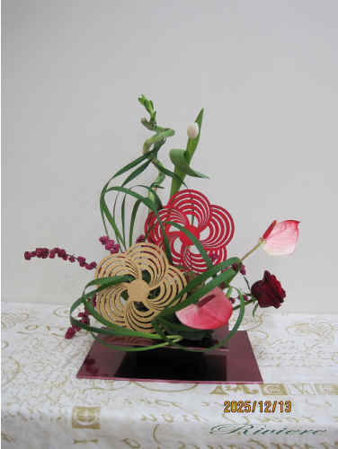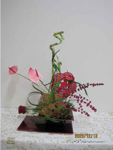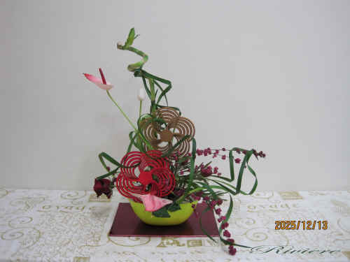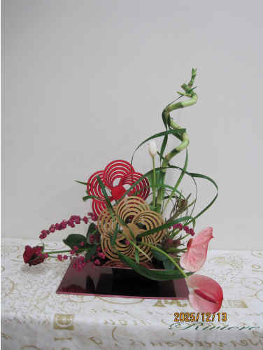 流鏑馬と梅文様で迎える2026年 2026年午年に因んで流鏑馬をデザインしました。疾走する馬から放つ鏑矢。この鏑矢は周りの空気を振動させるような音を出します。この一連の神事は独特な世界を生み出します。梅文様の的に向かって鏑矢に見立てたアンスリュウム そしてまるで竜が空中をうねるような振動。グリーンのミスカンサスでこの空気感を描く事をテーマにしてみました。小刻みに振動したり大きなうねりを出したりその波動を描いています。どれも力作な作品となりました。 2025年最後の教室らしく 精一杯馬と共に疾走した 達成感のある作品です。 |