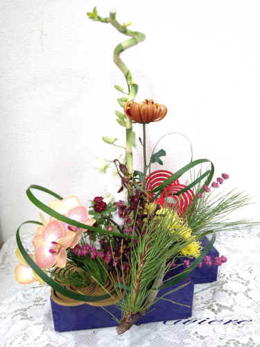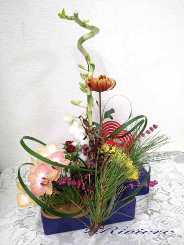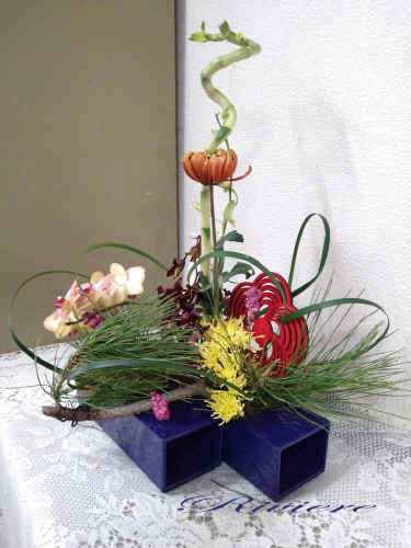 お正月用アレンジメント特別講習 曲がり松は両先端に葉が茂っている物、二つの器に上手くまとめました。松葉は梅型に差し込み、糸菊やシンフォリカルポスのラインでバンブーに集中させています。 きっと、伸びやかで晴々しい新年を迎えられることでしょう。 |