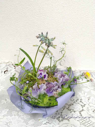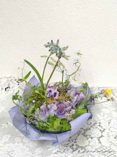 ルノワールの幸福 レイボーパウダーを使って幸福の画家ルノワールの世界をアレンジします。ギリアの葉や豆のツルが全体を柔らかく包み、優しい空気が流れます。ラケナリアは寄り添う姉妹、西洋美術館印象派展「室内の眼差し」からアレンジしました。 |