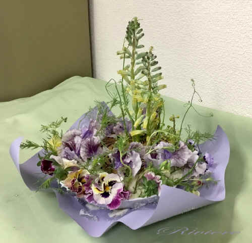 ルノワールの世界 フリルパンジー(カルメン)やスイトピーのフリルでルノワールの質感を、豆の花ツルやギリアの葉でルノワールのタッチを表現しています。ギリアトリコロルや豆の花の愛らしさもアレンジしながら楽しめました。今日のパウダーカラーはクリーム色、優しい世界に包まれます。 |
