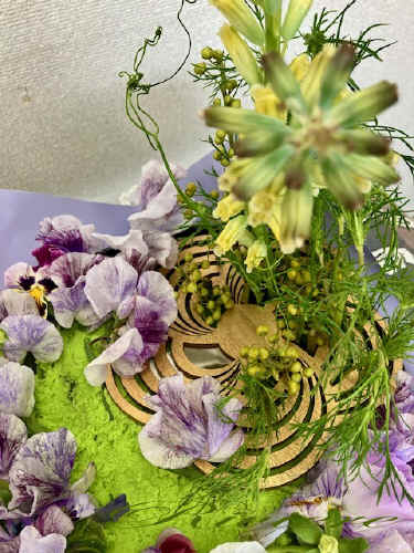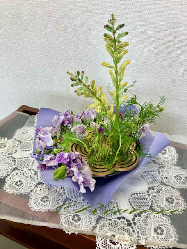 ルノワールの世界 スイトピー・フリルパンジー・等の同一トーンでラッピング用紙を使い器をカバーし梅型のひねりある穴を使い中心から淵にかけたアレンジです。カラーパウダーをクレッセント型に残しステージを広げた点もみのがせません。スイトピー・パンジーのフリルをつなげて可愛らしい質感もだせました。アオモジの粒々が光の粒子の様ですし 豆の花の細いツルを二人の少女に見立てたラケナリアに巻きつけたりギリアの葉をふわりとそれぞれの花々に被せルノアールの世界を見る様です。柔らかな筆致と愛らしい子供を多く描き 心が和み幸せな気持ちになりました。 |