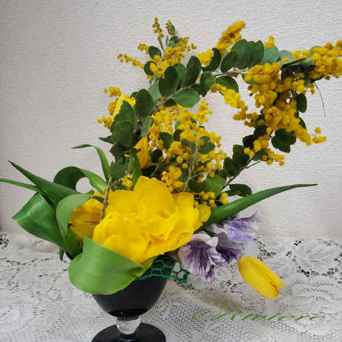 ミモザとチューリップの室内装飾 今回はミモザをカーブさせてチューリップの上に降り注ぐ様子に苦戦しました。アーチ仕立ての方向を変えて落着。黄色はやっぱり気持ちが明るく元気になれる色ですね。 |