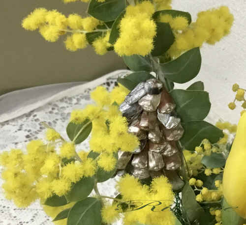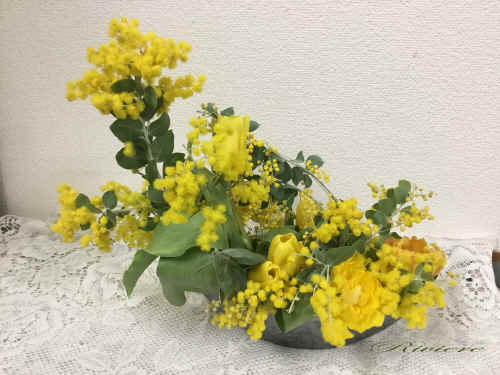 ミモザの室内装飾 満開のミモザの香りに包まれてチューリプをアレンジしました。まるで二階からミモザの枝越しにチューリプを眺めるように、お部屋に黄色い世界をもたらします。赤松の鱗片で作ったベルもあしらって、春の幸せの鐘が響きます。 |