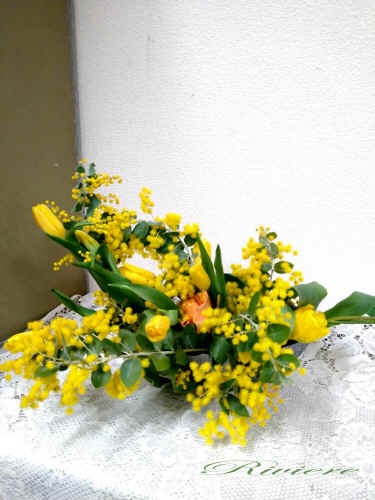 ミモザの室内装飾 真珠葉ミモザも終盤になり、たわわに花開いています。室内に持ち込んだミモザはチューリプの存在を上回ってすっかり早春のクィーン! シングル咲や八重咲のチューリップがその後を追いかけます。 作者が捉えた早春の印象をミモザでアレンジしました。 |