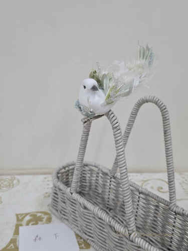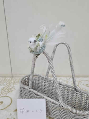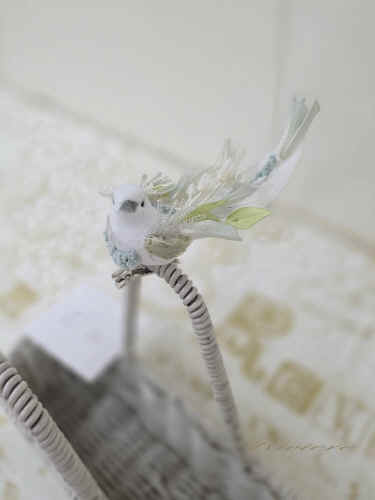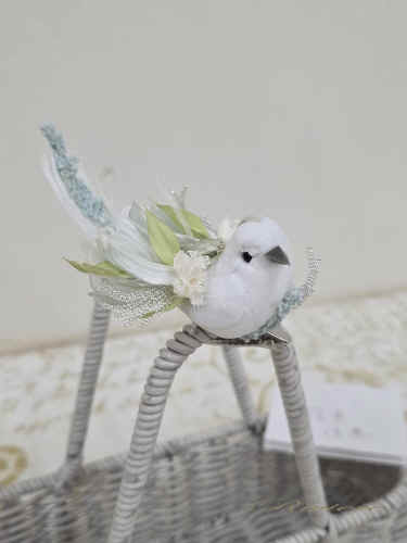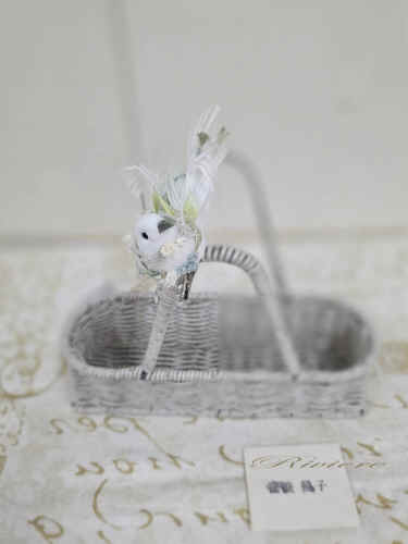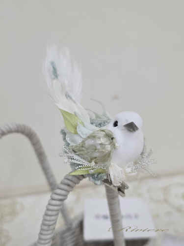 スプリングバードをドライで飾る シェーネアルバイテンで作る羽を作成後、ドライの花装飾をして頂きました。ドライフラワーを使ってボディーに色付けをしていきます。お一人お一人愛らしい鳥が完成しました。最後にシルバーのシェーネアルバイテンを入れます。それが入ることで作品にどの様な効果が生まれるのか、またその見せ方を学んで頂きました。 |