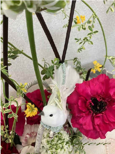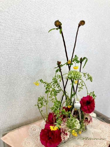 ダヴィンチ・ノット<結び目紋様> ミラノのスフォルツァ城の「アッセの間」の天井画の中心から絡み合う結び目紋様を春の訪れを告げるゼンマイの交差とコロニラバリエガータをふんわり掛けて空間を表現しました。 |