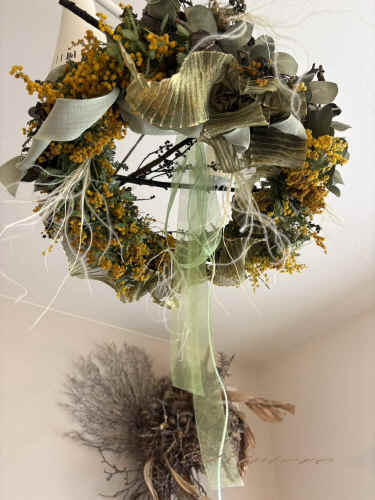 フライングリース アオモジの緑の茎がドライになって見事に黒に変化しました。ミモザとの色の濃淡が美しい。下げて飾ったら茎の交差が床に映る。この下に立てば幸福が訪れるという言い伝えを実感。ゆったりと揺れるのもフライングリースの特権。 |