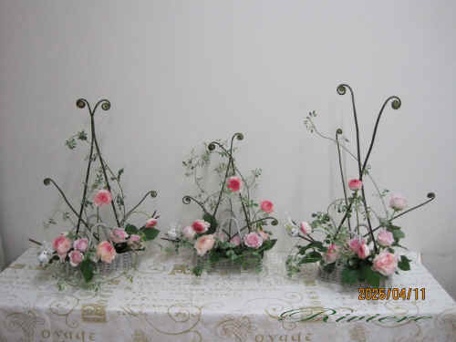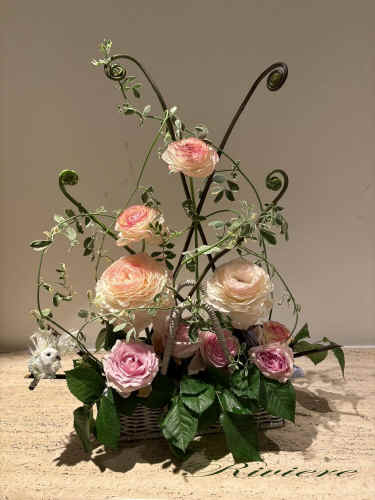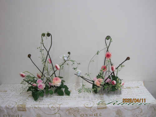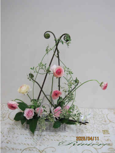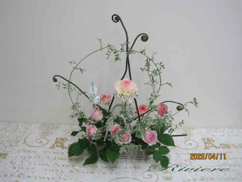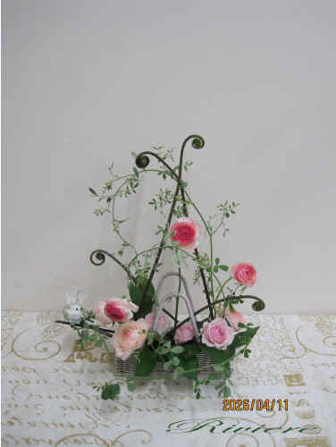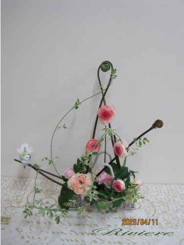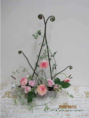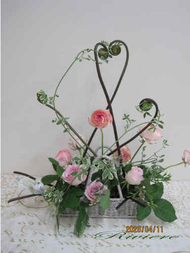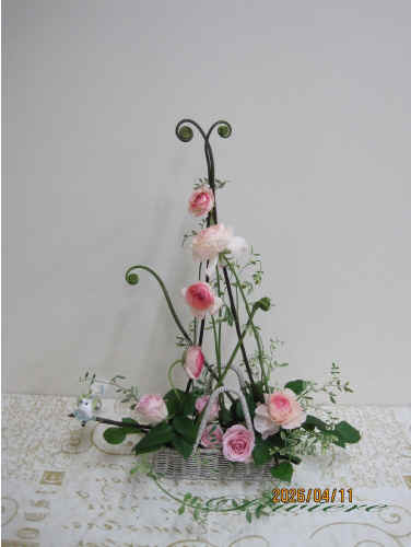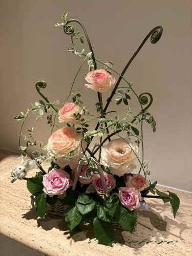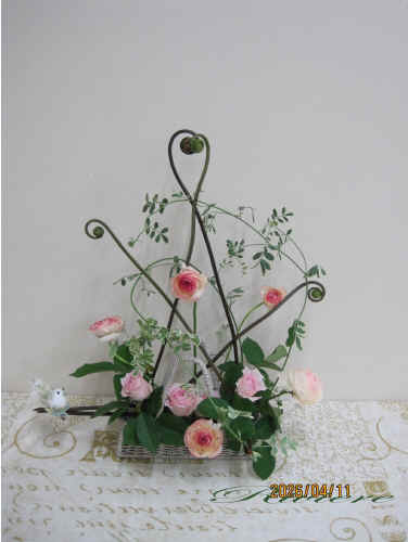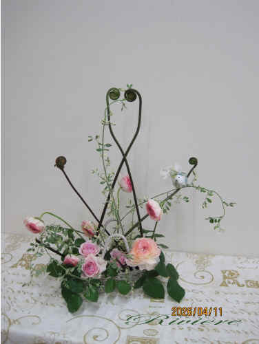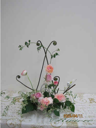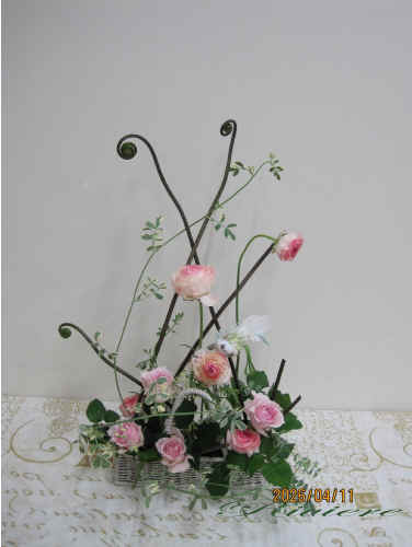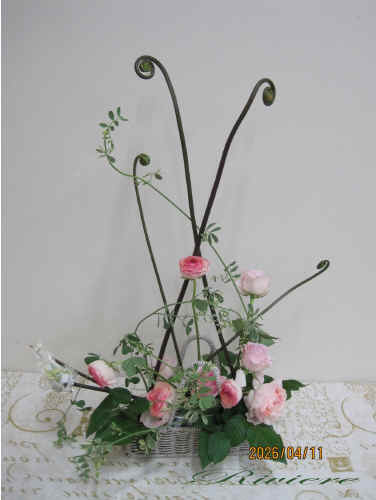 ダ・ヴィンチノットデザイン ゼンマイの交差がやがてコロニラ・バリエガータを受けとめるメカニクスとなるアレンジです。3本のコロニラ・バリエガータでアレンジとしての高さ 厚み 幅の大事な要素が生まれます。更に前回作成した小鳥が加わって自然な景色がバスケットに描かれました。花の季節の到来に土曜日の午後のクラスは明るい笑い声が響きました。 |