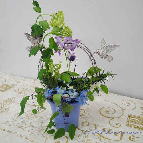花唐草 リースをたたせてCカーブのアレンジをします。リースをビバーナムで立たせながらあわせてCカーブを描く方法を研究してみました。 |